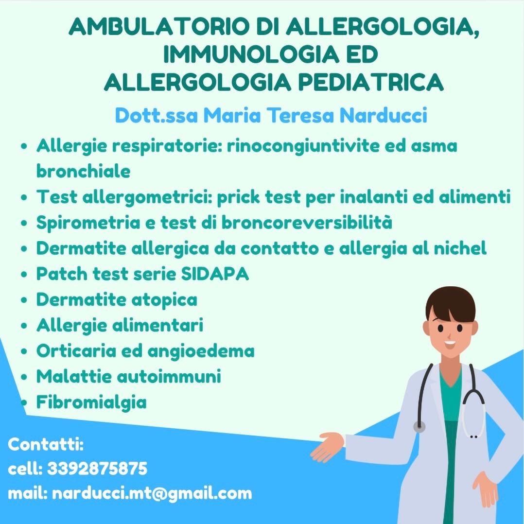 Ciao, sono la dott.ssa Maria Teresa Narducci, specialista in Allergologia e Immunologia Clinica ed ho conseguito un Master di II livello in Allergologia e Pneumologia Pediatrica, dunque mi occupo sia del paziente pediatrico che del paziente adulto.